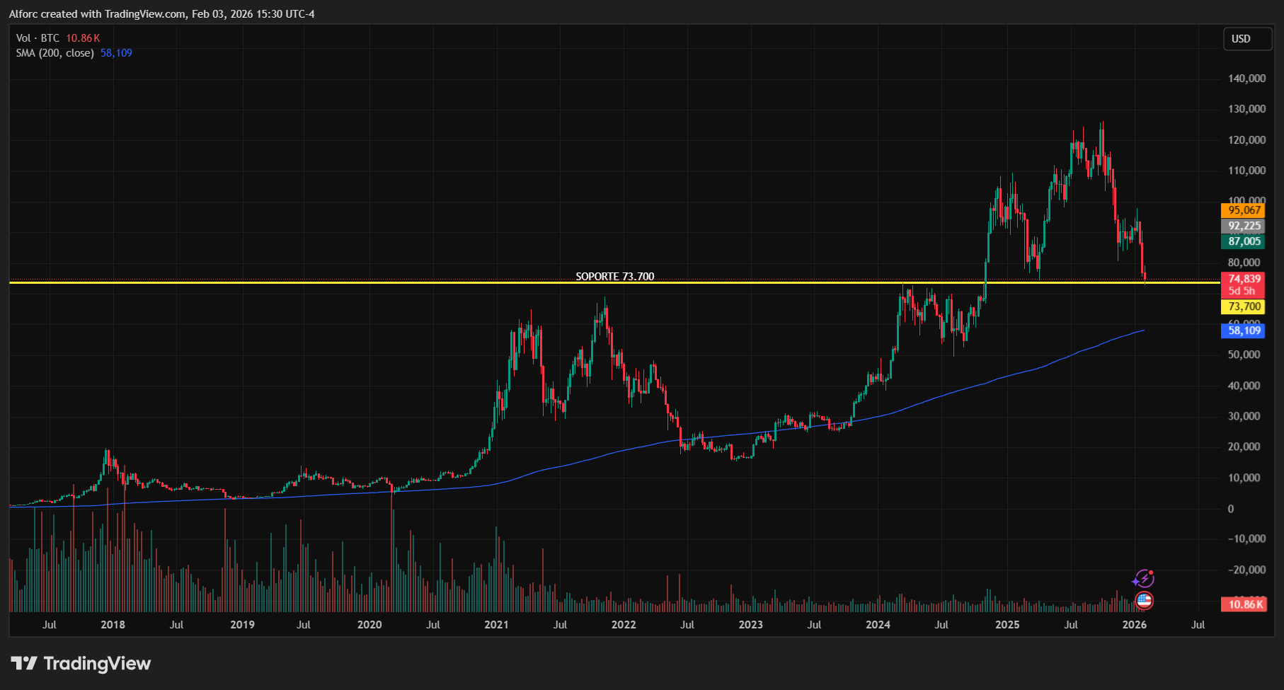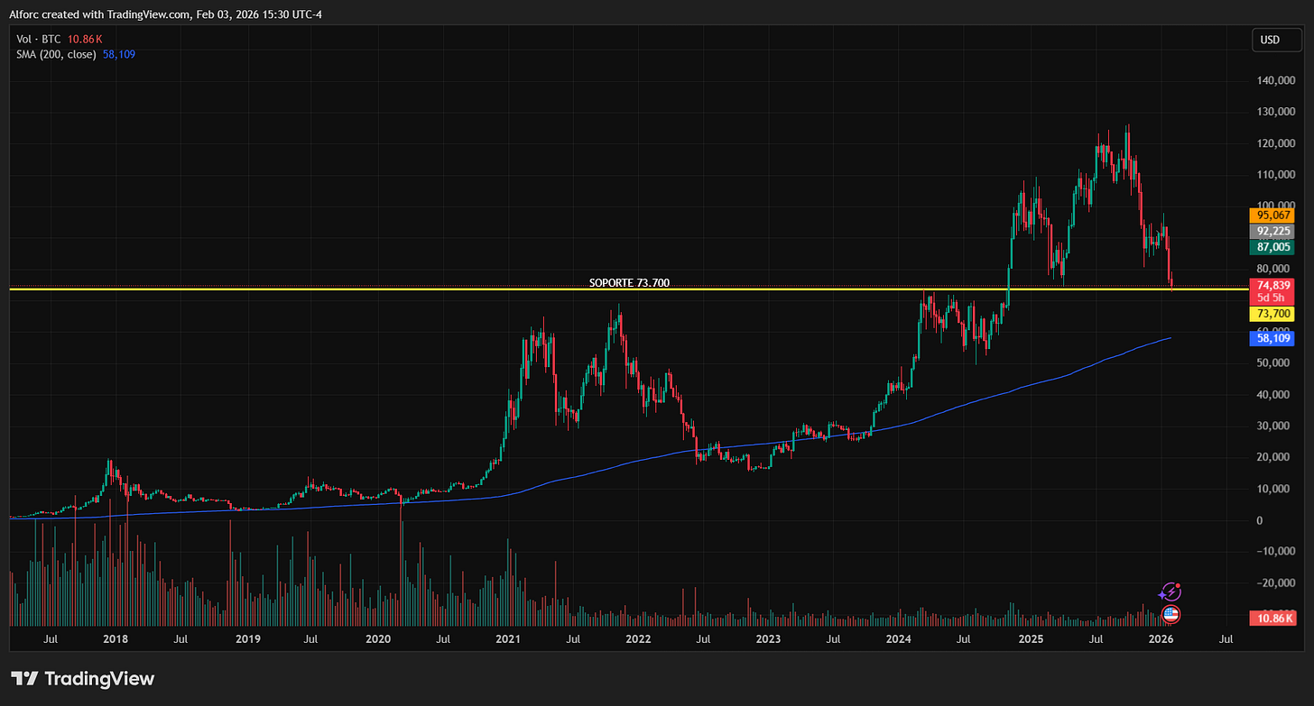 El Objetivo Bajista: Esa media móvil está actualmente en los $58,000. Si llegamos ahí, la tesis del ciclo de 4 años se habrá cumplido a la baja de forma brutal.