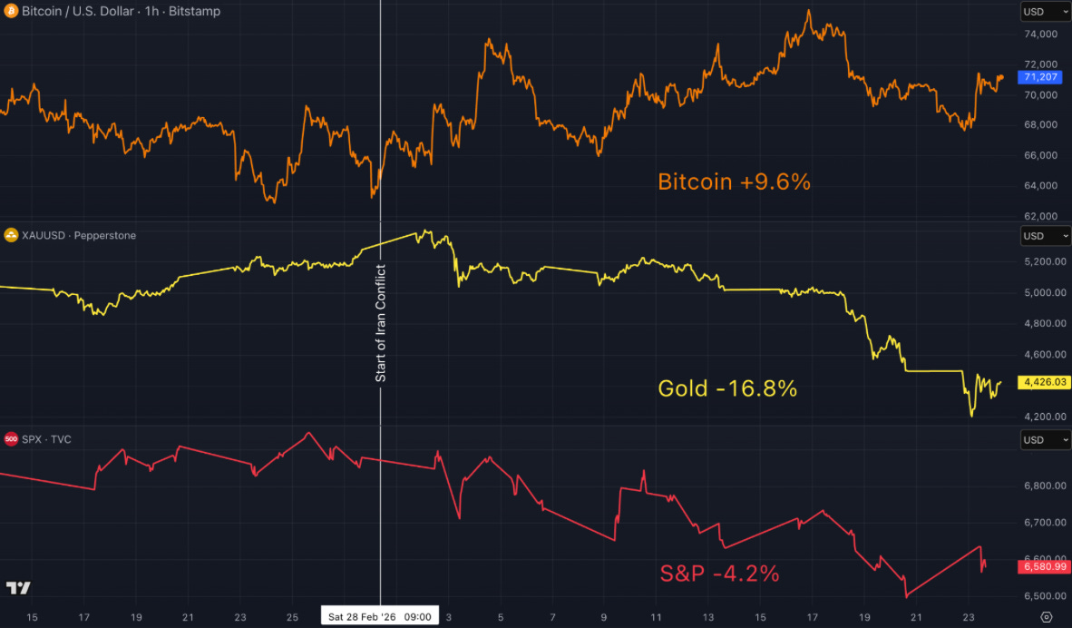 Sobrinos, miren bien este gráfico que encontré en X. Comparamos el rendimiento de Bitcoin, el Oro y el S&P 500 desde que estalló el conflicto.