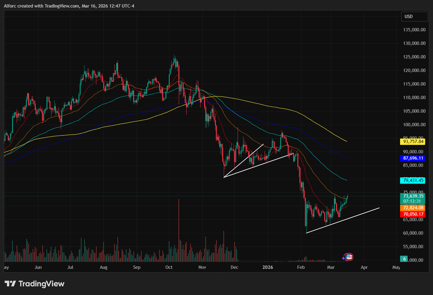 Bitcoin (BTC): Rompiendo con fuerza hasta los $73,375.9, un salto del +2.82%. ¡Recuerden que hace nada el 10 de marzo, se reportaba que BTC había caído un -21.2% en el año, siendo aplastado por el Oro y el Petróleo! El rey ha vuelto.