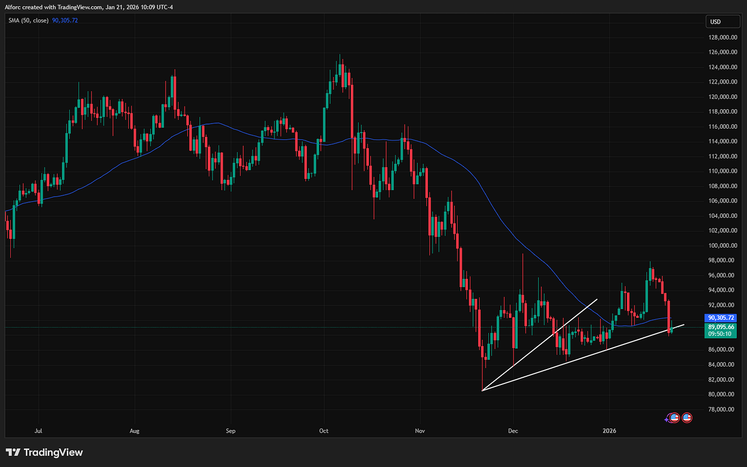 Bitcoin (BTC): Sufriendo en los $88,706.8, con una caída del -2.40%. Perdió el soporte de los $90k, lo que ha desencadenado el pánico.