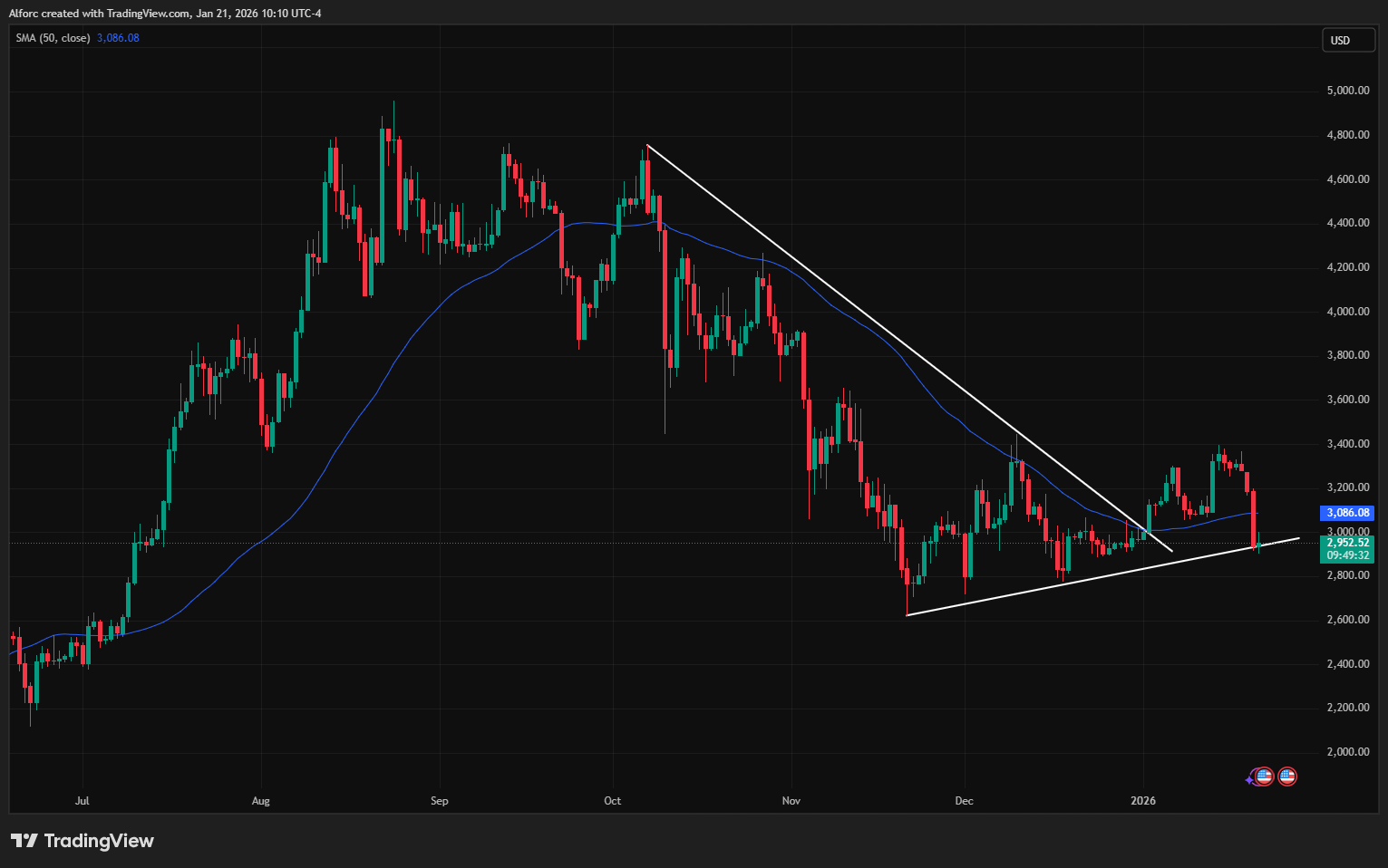 Ethereum (ETH): El más golpeado, cayendo a $2,929.72 (-4.78%). Perder los $3k es psicológicamente doloroso.