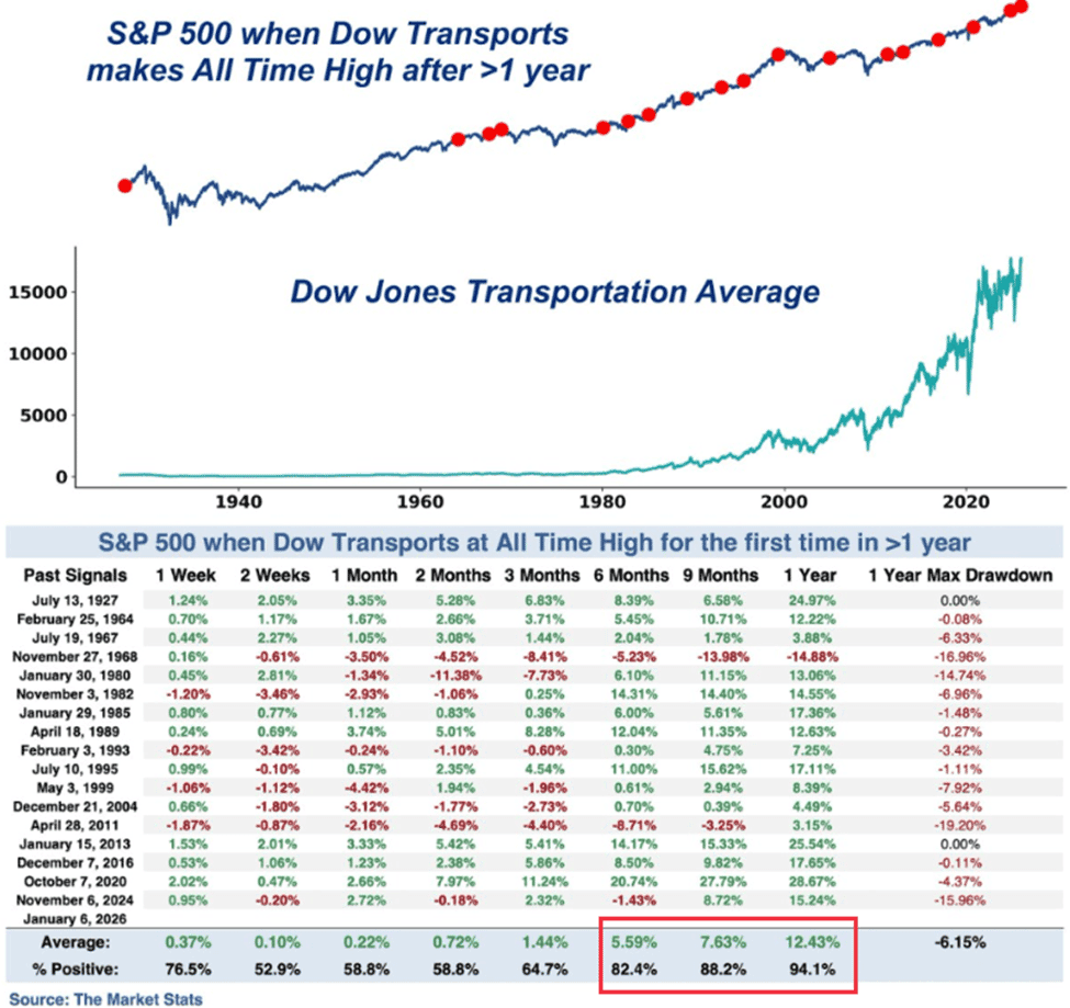 Los índices de Transporte e Industriales están rompiendo máximos. Según la vieja escuela de Wall Street, cuando los que “hacen cosas” y los que “mueven cosas” suben, la economía está sana.