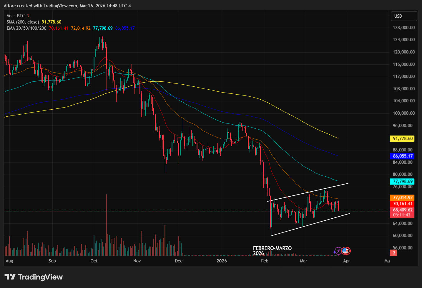 Bitcoin (BTC): Cae un -3.54% hasta los $68,287. El soporte de los $70k se rompió como cristal.
